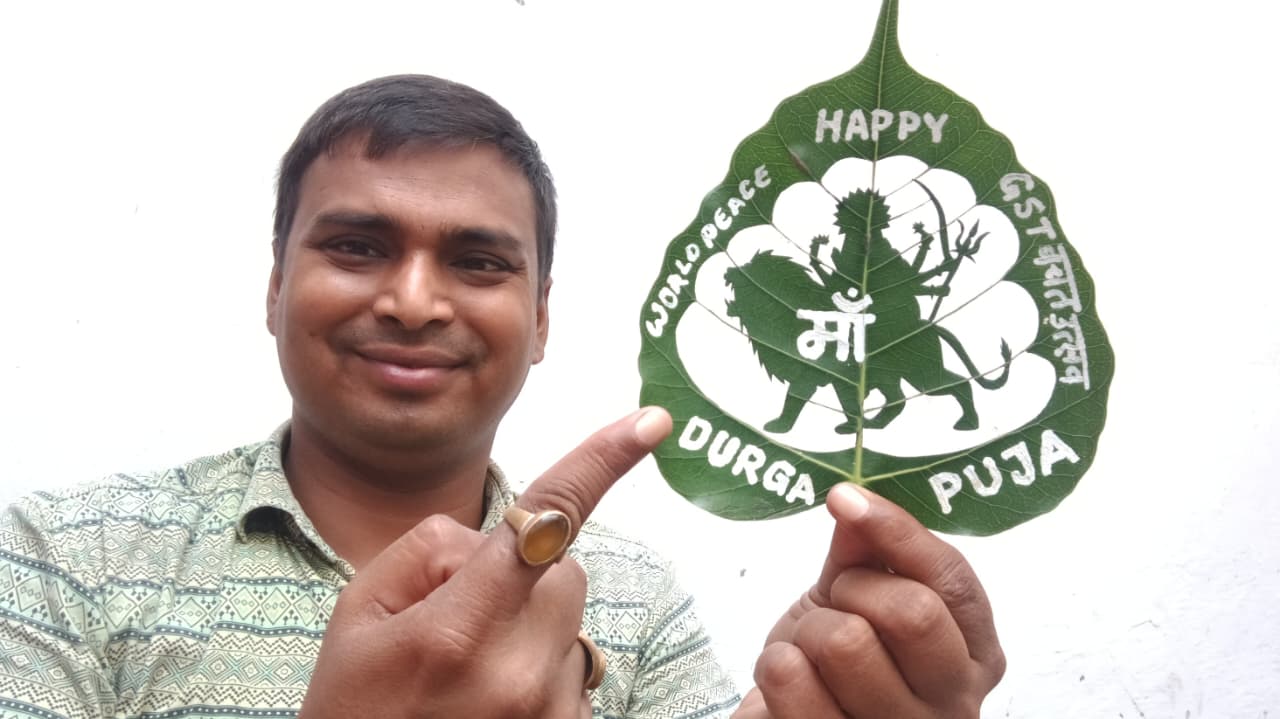 मोतिहारी: अंतर्राष्ट्रीय लीफ आर्टिस्ट मधुरेंद्र कुमार ने दुर्गा पूजा के अवसर पर बिहार में “हैप्पी...