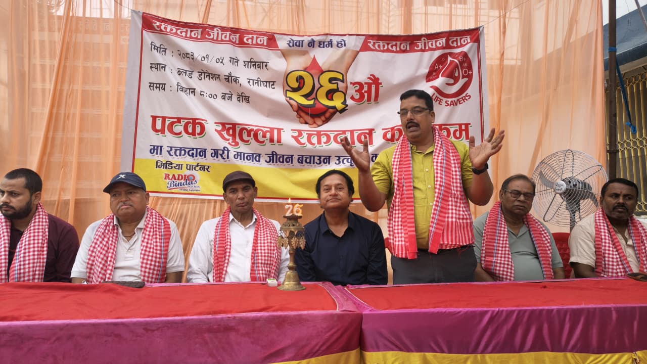 दुर्गा पूजा समिति रानीघाट द्वारा आयोजित 26वें खुले रक्तदान कार्यक्रम का आयोजन समिति के अध्यक्ष सतीश सिंह राजपूत की अध्यक्षता में किया गया। कार्यक्रम में मुख्य अतिथि सुरेन्द्र प्रसाद यादव उपस्थित रहे, जबकि विशिष्ट अतिथियों में वार्ड नंबर 8 के वार्ड अध्यक्ष जवाहर प्रसाद गुप्ता, नेपाल रेडक्रॉस सोसाइटी बीरगंज शाखा के अध्यक्ष बृजकिशोर प्रसाद पटेल, सौरभ राज पांडे तथा कार्यसमिति सदस्य दिनानाथ रौनियार शामिल थे।