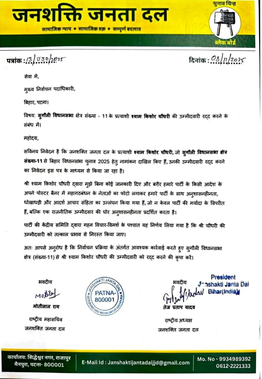 लोकल डेस्क  ऋषि राज बिहार विधानसभा चुनाव-2025 में जनशक्ति जनता दल से श्याम किशोर चौधरी सुगौली(विधानसभा क्षेत्र...