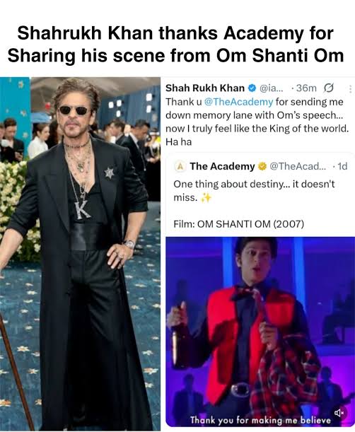 बॉलीवुड सुपरस्टार शाहरुख खान एक बार फिर अंतरराष्ट्रीय स्तर पर सुर्खियों में हैं। हाल ही में एकेडमी ऑफ मोशन पिक्चर आर्ट्स एंड साइंसेज (ऑस्कर अकादमी) ने उनकी फिल्म ‘ओम शांति ओम’ का मशहूर स्पीच अपने आधिकारिक सोशल मीडिया हैंडल पर शेयर किया, जिसके बाद यह वीडियो तेजी से वायरल हो गया।